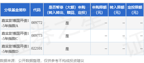 本站讯息,12月29日嘉实基金责罚有限公司发布《对于嘉实彭博国开行债券1-5年指数证券投资基金2026年元旦节前暂停申购(含调度转入)业务的公告》。公告中教唆,为了保证基金的幽静运作,保护基金份额握有东谈主利益,自2025年12月31日起嘉实彭博国开行债券1-5年指数证券投资基金2026年元旦节前暂停申购(含调度转入)业务,下属分级基金调治明细如下: