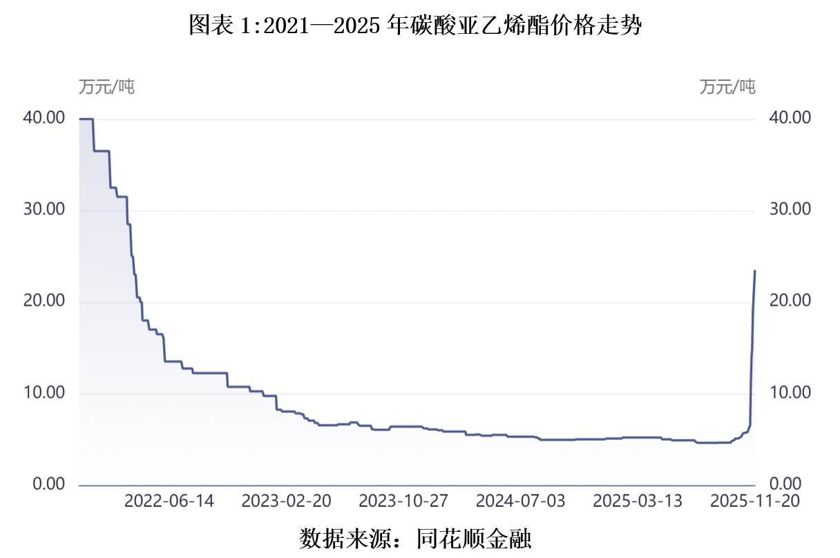 咫尺,电解液添加剂VC(碳酸亚乙烯酯)已经看守一天一个价的高涨态势,从11月初的6万元/吨已飙升至11月20日的23.5万元/吨。同期VC龙头华盛锂电(688353.SH)股价在短期飙涨近200%,随后又大幅回调,VC加价的可捏续性似乎受到市集质疑。