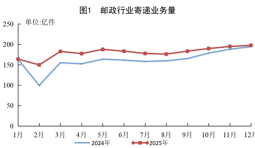 其中,12月份,邮政行业递送业务量完成197.7亿件,同比增长1.8%。其中,快递业务量完成182.1亿件,同比增长2.3%。